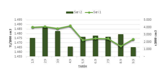 Organize Toptan Doğal Gaz Satış Piyasası (OTSP) dahilinde 01.09.2019 – 09.09.2019 tarihleri arası ortalama Gaz Referans Fiyatı (GRF) 1,479.04 TL/1000 sm3 olarak belirlenirken, aynı tarihler arasında toplam gerçekleşen eşleşmelerin miktarı ise 23,964 x1000 sm3 olarak belirlendi. İlgili tarihler arasında günlük Gaz Referans Fiyatı (GRF) ile Eşleşme Miktarı verileri aşağıdaki grafikte yer almaktadır.