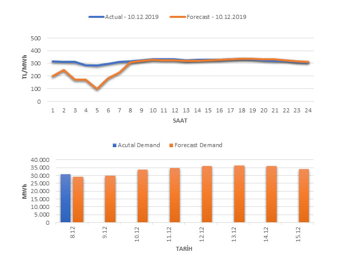 Tahminleme Modeli* analizi sonucu ortalama piyasa takas fiyatı 286.09 TL/MWh ve ortalama tüketim 33,629 MWh olarak öngörülmektedir. Modelin piyasa takas fiyatına dair başarı oranı günlük % –25, tüketime dair başarı oranı** ise günlük % 95 olarak hesaplanırken, bugüne kadar yapılan piyasa takas fiyatına dair analizlere göre başarı oranı % 91, tüketime dair başarı oranı ise % 94 olarak hesaplanmaktadır. Saatlik yarın için oluşan ve tahmin edilen piyasa takas fiyatları ile haftalık bazda tahmin edilen ve gerçekleştikçe yer alacak günlük ortalama tüketim değerleri aşağıdaki grafiklerde yer almaktadır.