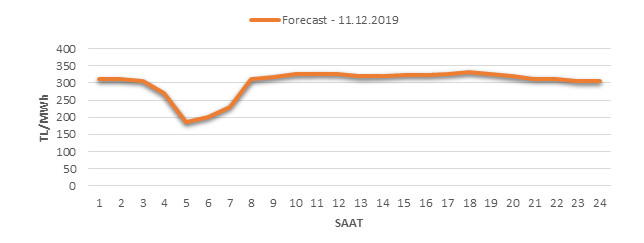 Yarından sonraki gün için oluşacak ortalama piyasa takas fiyatı 301.49 TL/MWH olarak tahmin edilmektedir. Buna bağlı olarak günün maksimum fiyatı 331.29 TL/MWh olarak 17:00 – 18:00 saat aralığında, minimum fiyatı 184.99 TL/MWh olarak 04:00 – 05:00 saat aralığında gerçekleşeceği öngörülmektedir. Puant saatlerde (17:00 – 22:00) tahmini ortalama piyasa takas fiyatı ise 317.45 TL/MWh olarak hesaplanabilmektedir. Saatlik oluşacak piyasa takas fiyatı tahminleri aşağıdaki grafikte yer almaktadır.