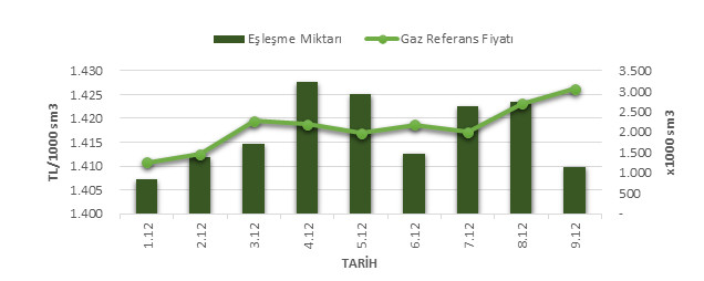 Organize Toptan Doğal Gaz Satış Piyasası (OTSP) dahilinde 01.12.2019 – 09.12.2019 tarihleri arası ortalama Gaz Referans Fiyatı (GRF) 1,418.19 TL/1000 sm3 olarak belirlenirken, aynı tarihler arasında toplam gerçekleşen eşleşmelerin miktarı ise 18,096 x1000 sm3 olarak belirlendi. İlgili tarihler arasında günlük Gaz Referans Fiyatı (GRF) ile Eşleşme Miktarı verileri aşağıdaki grafikte yer almaktadır.