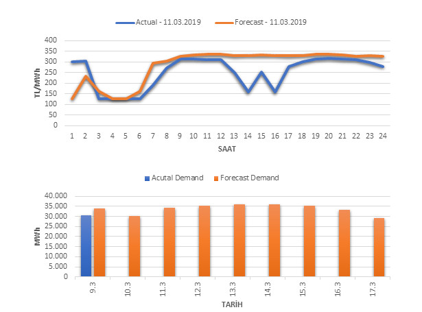 Tahminleme Modeli* analizi sonucu ortalama piyasa takas fiyatı 283.82 TL/MWh ve ortalama tüketim 34,119 MWh olarak öngörülmektedir. Modelin piyasa takas fiyatına dair başarı oranı günlük % 61, tüketime dair başarı oranı** ise günlük % 89 olarak hesaplanırken, bugüne kadar yapılan piyasa takas fiyatına dair analizlere göre başarı oranı % 88, tüketime dair başarı oranı ise % 95 olarak hesaplanmaktadır. Saatlik yarın için oluşan ve tahmin edilen piyasa takas fiyatları ile haftalık bazda tahmin edilen ve gerçekleştikçe yer alacak günlük ortalama tüketim değerleri aşağıdaki grafiklerde yer almaktadır.