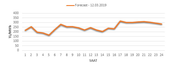 Yarından sonraki gün için oluşacak ortalama piyasa takas fiyatı 253.11 TL/MWH olarak tahmin edilmektedir. Buna bağlı olarak günün maksimum fiyatı 317.08 TL/MWh olarak 16:00 – 17:00 saat aralığında, minimum fiyatı 164.77 TL/MWh olarak 04:00 – 05:00 saat aralığında gerçekleşeceği öngörülmektedir. Puant saatlerde (17:00 – 22:00) tahmini ortalama piyasa takas fiyatı ise 303.07 TL/MWh olarak hesaplanabilmektedir. Saatlik oluşacak piyasa takas fiyatı tahminleri aşağıdaki grafikte yer almaktadır.