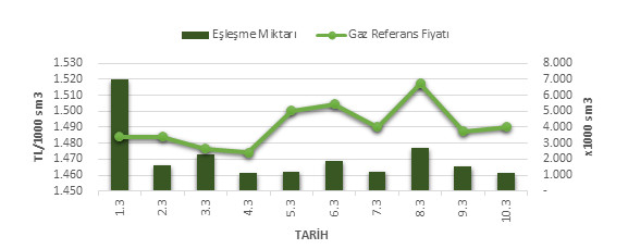 Organize Toptan Doğal Gaz Satış Piyasası (OTSP) dahilinde 01.03.2019 – 10.03.2019 tarihleri arası ortalama Gaz Referans Fiyatı (GRF) 1,490.92 TL/1000 sm3 olarak belirlenirken, aynı tarihler arasında toplam gerçekleşen eşleşmelerin miktarı ise 21,590 x1000 sm3 olarak belirlendi. İlgili tarihler arasında günlük Gaz Referans Fiyatı (GRF) ile Eşleşme Miktarı verileri aşağıdaki grafikte yer almaktadır.