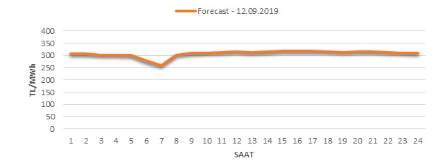 Yarından sonraki gün için oluşacak ortalama piyasa takas fiyatı 305.74 TL/MWH olarak tahmin edilmektedir. Buna bağlı olarak günün maksimum fiyatı 316.36 TL/MWh olarak 16:00 – 17:00 saat aralığında, minimum fiyatı 259 TL/MWh olarak 06:00 – 07:00 saat aralığında gerçekleşeceği öngörülmektedir. Puant saatlerde (17:00 – 22:00) tahmini ortalama piyasa takas fiyatı ise 312.49 TL/MWh olarak hesaplanabilmektedir. Saatlik oluşacak piyasa takas fiyatı tahminleri aşağıdaki grafikte yer almaktadır.