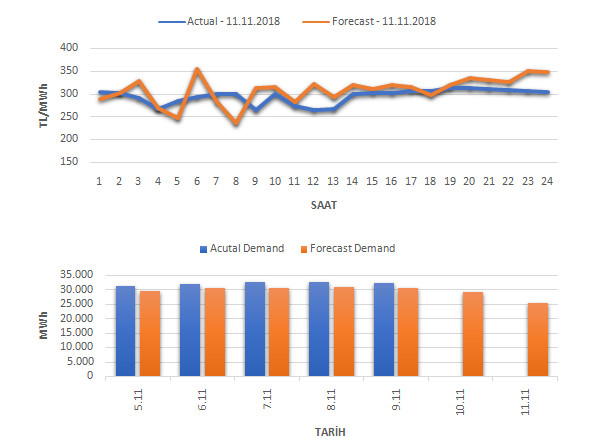 Tahminleme Modeli* analizi sonucu ortalama piyasa takas fiyatı 308.11 TL/MWh ve ortalama tüketim 25,474 MWh olarak öngörülmektedir. Modelin piyasa takas fiyatına dair başarı oranı günlük % 36, tüketime dair başarı oranı** ise günlük % 95 olarak hesaplanırken, bugüne kadar yapılan piyasa takas fiyatına dair analizlere göre başarı oranı % 87, tüketime dair başarı oranı ise % 92 olarak hesaplanmaktadır. Saatlik yarın için oluşan ve tahmin edilen piyasa takas fiyatları ile haftalık bazda tahmin edilen ve gerçekleştikçe yer alacak günlük ortalama tüketim değerleri aşağıdaki grafiklerde yer almaktadır.