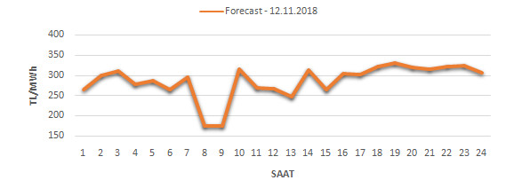 Yarından sonraki gün için oluşacak ortalama piyasa takas fiyatı 285.63 TL/MWH olarak tahmin edilmektedir. Buna bağlı olarak günün maksimum fiyatı 329.38 TL/MWh olarak 18:00 – 19:00 saat aralığında, minimum fiyatı 174.22 TL/MWh olarak 07:00 – 08:00 saat aralığında gerçekleşeceği öngörülmektedir. Puant saatlerde (17:00 – 22:00) tahmini ortalama piyasa takas fiyatı ise 321.57 TL/MWh olarak hesaplanabilmektedir. Saatlik oluşacak piyasa takas fiyatı tahminleri aşağıdaki grafikte yer almaktadır.
