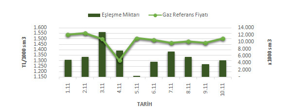 Organize Toptan Doğal Gaz Satış Piyasası (OTSP) dahilinde 01.10.2018 – 10.11.2018 tarihleri arası ortalama Gaz Referans Fiyatı (GRF) 1,478.96 TL/1000 sm3 olarak belirlenirken, aynı tarihler arasında toplam gerçekleşen eşleşmelerin miktarı ise 56,703 x1000 sm3 olarak belirlendi. İlgili tarihler arasında günlük Gaz Referans Fiyatı (GRF) ile Eşleşme Miktarı verileri aşağıdaki grafikte yer almaktadır.