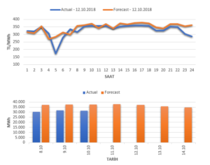 Tahminleme Modeli* analizi sonucu ortalama piyasa takas fiyatı 345,76 TL/MWh ve ortalama tüketim 37.158 MWh olarak öngörülmektedir. Modelin piyasa takas fiyatına dair başarı oranı günlük % 81, tüketime dair başarı oranı** ise günlük % 80 olarak hesaplanırken, bugüne kadar yapılan piyasa takas fiyatına dair analizlere göre başarı oranı % 86, tüketime dair başarı oranı ise % 95 olarak hesaplanmaktadır. Saatlik yarın için oluşan ve tahmin edilen piyasa takas fiyatları ile haftalık bazda tahmin edilen ve gerçekleştikçe yer alacak günlük ortalama tüketim değerleri aşağıdaki grafiklerde yer almaktadır.