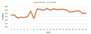 Yarından sonraki gün için oluşacak ortalama piyasa takas fiyatı 320,69 TL/MWH olarak tahmin edilmektedir. Buna bağlı olarak günün maksimum fiyatı 377,68 TL/MWh olarak 11:00 – 12:00 saat aralığında, minimum fiyatı 228,11 TL/MWh olarak 07:00 – 08:00 saat aralığında gerçekleşeceği öngörülmektedir. Puant saatlerde (17:00 – 22:00) tahmini ortalama piyasa takas fiyatı ise 332,75 TL/MWh olarak hesaplanabilmektedir. Saatlik oluşacak piyasa takas fiyatı tahminleri aşağıdaki grafikte yer almaktadır.