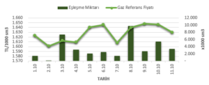 Organize Toptan Doğal Gaz Satış Piyasası (OTSP) dahilinde 01.10.2018 – 11.10.2018 tarihleri arası ortalama Gaz Referans Fiyatı (GRF) 1.627,69 TL/1000 sm3 olarak belirlenirken, aynı tarihler arasında toplam gerçekleşen eşleşmelerin miktarı ise 39.710 x1000 sm3 olarak belirlendi. İlgili tarihler arasında günlük Gaz Referans Fiyatı (GRF) ile Eşleşme Miktarı verileri aşağıdaki grafikte yer almaktadır.