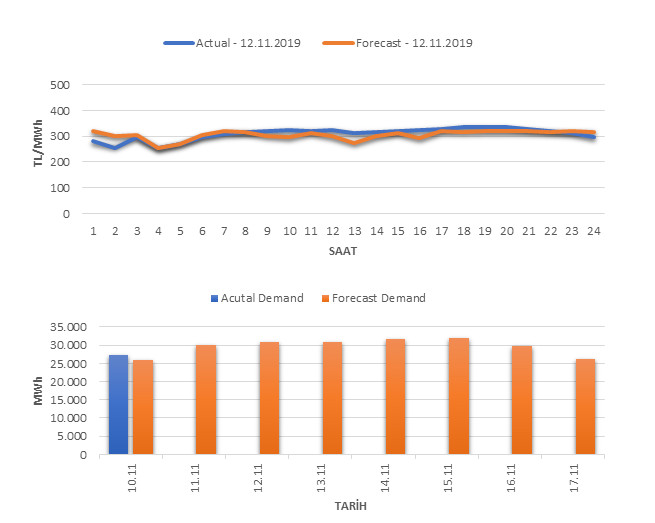 Tahminleme Modeli* analizi sonucu ortalama piyasa takas fiyatı 305.1 TL/MWh ve ortalama tüketim 30,775 MWh olarak öngörülmektedir. Modelin piyasa takas fiyatına dair başarı oranı günlük % 75, tüketime dair başarı oranı** ise günlük % 94 olarak hesaplanırken, bugüne kadar yapılan piyasa takas fiyatına dair analizlere göre başarı oranı % 91, tüketime dair başarı oranı ise % 93 olarak hesaplanmaktadır. Saatlik yarın için oluşan ve tahmin edilen piyasa takas fiyatları ile haftalık bazda tahmin edilen ve gerçekleştikçe yer alacak günlük ortalama tüketim değerleri aşağıdaki grafiklerde yer almaktadır.