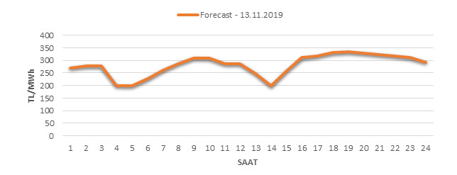 Yarından sonraki gün için oluşacak ortalama piyasa takas fiyatı 283.04 TL/MWH olarak tahmin edilmektedir. Buna bağlı olarak günün maksimum fiyatı 336 TL/MWh olarak 18:00 – 19:00 saat aralığında, minimum fiyatı 199 TL/MWh olarak 04:00 – 05:00 saat aralığında gerçekleşeceği öngörülmektedir. Puant saatlerde (17:00 – 22:00) tahmini ortalama piyasa takas fiyatı ise 325.98 TL/MWh olarak hesaplanabilmektedir. Saatlik oluşacak piyasa takas fiyatı tahminleri aşağıdaki grafikte yer almaktadır.