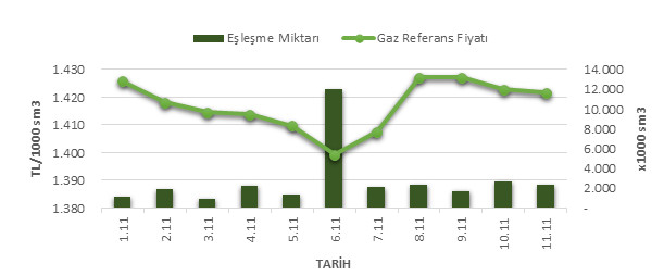 Organize Toptan Doğal Gaz Satış Piyasası (OTSP) dahilinde 01.11.2019 – 11.11.2019 tarihleri arası ortalama Gaz Referans Fiyatı (GRF) 1,416.98 TL/1000 sm3 olarak belirlenirken, aynı tarihler arasında toplam gerçekleşen eşleşmelerin miktarı ise 30,776 x1000 sm3 olarak belirlendi. İlgili tarihler arasında günlük Gaz Referans Fiyatı (GRF) ile Eşleşme Miktarı verileri aşağıdaki grafikte yer almaktadır.