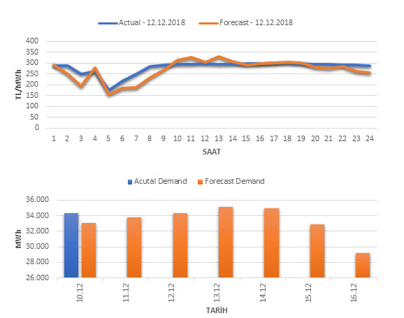 Tahminleme Modeli* analizi sonucu ortalama piyasa takas fiyatı 268.55 TL/MWh ve ortalama tüketim 34,324 MWh olarak öngörülmektedir. Modelin piyasa takas fiyatına dair başarı oranı günlük % 78, tüketime dair başarı oranı** ise günlük % 96 olarak hesaplanırken, bugüne kadar yapılan piyasa takas fiyatına dair analizlere göre başarı oranı % 87, tüketime dair başarı oranı ise % 93 olarak hesaplanmaktadır. Saatlik yarın için oluşan ve tahmin edilen piyasa takas fiyatları ile haftalık bazda tahmin edilen ve gerçekleştikçe yer alacak günlük ortalama tüketim değerleri aşağıdaki grafiklerde yer almaktadır.