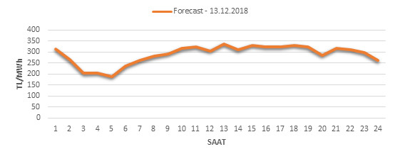Yarından sonraki gün için oluşacak ortalama piyasa takas fiyatı 288.4 TL/MWH olarak tahmin edilmektedir. Buna bağlı olarak günün maksimum fiyatı 335.64 TL/MWh olarak 12:00 – 13:00 saat aralığında, minimum fiyatı 188.42 TL/MWh olarak 04:00 – 05:00 saat aralığında gerçekleşeceği öngörülmektedir. Puant saatlerde (17:00 – 22:00) tahmini ortalama piyasa takas fiyatı ise 309.85 TL/MWh olarak hesaplanabilmektedir. Saatlik oluşacak piyasa takas fiyatı tahminleri aşağıdaki grafikte yer almaktadır.