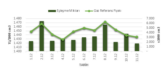 Organize Toptan Doğal Gaz Satış Piyasası (OTSP) dahilinde 01.12.2018 – 11.12.2018 tarihleri arası ortalama Gaz Referans Fiyatı (GRF) 1,449.12 TL/1000 sm3 olarak belirlenirken, aynı tarihler arasında toplam gerçekleşen eşleşmelerin miktarı ise 34,979 x1000 sm3 olarak belirlendi. İlgili tarihler arasında günlük Gaz Referans Fiyatı (GRF) ile Eşleşme Miktarı verileri aşağıdaki grafikte yer almaktadır.