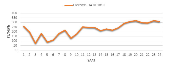 Yarından sonraki gün için oluşacak ortalama piyasa takas fiyatı 224.72 TL/MWH olarak tahmin edilmektedir. Buna bağlı olarak günün maksimum fiyatı 319.58 TL/MWh olarak 19:00 – 20:00 saat aralığında, minimum fiyatı 74.29 TL/MWh olarak 02:00 – 03:00 saat aralığında gerçekleşeceği öngörülmektedir. Puant saatlerde (17:00 – 22:00) tahmini ortalama piyasa takas fiyatı ise 305.36 TL/MWh olarak hesaplanabilmektedir. Saatlik oluşacak piyasa takas fiyatı tahminleri aşağıdaki grafikte yer almaktadır.