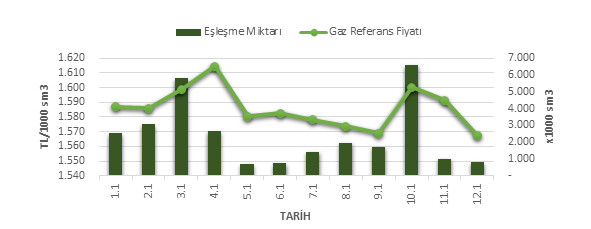 Organize Toptan Doğal Gaz Satış Piyasası (OTSP) dahilinde 01.12.2018 – 12.01.2019 tarihleri arası ortalama Gaz Referans Fiyatı (GRF) 1,585.73 TL/1000 sm3 olarak belirlenirken, aynı tarihler arasında toplam gerçekleşen eşleşmelerin miktarı ise 28,917 x1000 sm3 olarak belirlendi. İlgili tarihler arasında günlük Gaz Referans Fiyatı (GRF) ile Eşleşme Miktarı verileri aşağıdaki grafikte yer almaktadır.