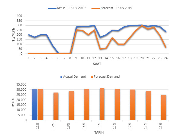 Tahminleme Modeli* analizi sonucu ortalama piyasa takas fiyatı 124.17 TL/MWh ve ortalama tüketim 28,804 MWh olarak öngörülmektedir. Modelin piyasa takas fiyatına dair başarı oranı günlük % 62, tüketime dair başarı oranı** ise günlük % 99 olarak hesaplanırken, bugüne kadar yapılan piyasa takas fiyatına dair analizlere göre başarı oranı % 88, tüketime dair başarı oranı ise % 95 olarak hesaplanmaktadır. Saatlik yarın için oluşan ve tahmin edilen piyasa takas fiyatları ile haftalık bazda tahmin edilen ve gerçekleştikçe yer alacak günlük ortalama tüketim değerleri aşağıdaki grafiklerde yer almaktadır.