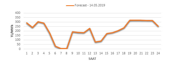 Yarından sonraki gün için oluşacak ortalama piyasa takas fiyatı 205.89 TL/MWH olarak tahmin edilmektedir. Buna bağlı olarak günün maksimum fiyatı 319.91 TL/MWh olarak 19:00 – 20:00 saat aralığında, minimum fiyatı 5.01 TL/MWh olarak 06:00 – 07:00 saat aralığında gerçekleşeceği öngörülmektedir. Puant saatlerde (17:00 – 22:00) tahmini ortalama piyasa takas fiyatı ise 304.81 TL/MWh olarak hesaplanabilmektedir. Saatlik oluşacak piyasa takas fiyatı tahminleri aşağıdaki grafikte yer almaktadır.