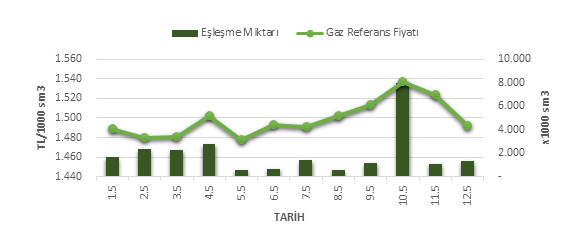 Organize Toptan Doğal Gaz Satış Piyasası (OTSP) dahilinde 01.05.2019 – 12.05.2019 tarihleri arası ortalama Gaz Referans Fiyatı (GRF) 1,498.58 TL/1000 sm3 olarak belirlenirken, aynı tarihler arasında toplam gerçekleşen eşleşmelerin miktarı ise 23,787 x1000 sm3 olarak belirlendi. İlgili tarihler arasında günlük Gaz Referans Fiyatı (GRF) ile Eşleşme Miktarı verileri aşağıdaki grafikte yer almaktadır.