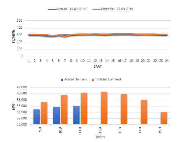Tahminleme Modeli* analizi sonucu ortalama piyasa takas fiyatı 305.1 TL/MWh ve ortalama tüketim 38,029 MWh olarak öngörülmektedir. Modelin piyasa takas fiyatına dair başarı oranı günlük % 80, tüketime dair başarı oranı** ise günlük % 88 olarak hesaplanırken, bugüne kadar yapılan piyasa takas fiyatına dair analizlere göre başarı oranı % 91, tüketime dair başarı oranı ise % 94 olarak hesaplanmaktadır. Saatlik yarın için oluşan ve tahmin edilen piyasa takas fiyatları ile haftalık bazda tahmin edilen ve gerçekleştikçe yer alacak günlük ortalama tüketim değerleri aşağıdaki grafiklerde yer almaktadır.