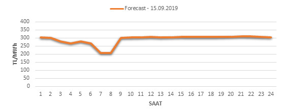 Yarından sonraki gün için oluşacak ortalama piyasa takas fiyatı 292.24 TL/MWH olarak tahmin edilmektedir. Buna bağlı olarak günün maksimum fiyatı 310.62 TL/MWh olarak 20:0021:00 saat aralığında, minimum fiyatı 206 TL/MWh olarak 06:0007:00 saat aralığında gerçekleşeceği öngörülmektedir. Puant saatlerde (17:0022:00) tahmini ortalama piyasa takas fiyatı ise 308.06 TL/MWh olarak hesaplanabilmektedir. Saatlik oluşacak piyasa takas fiyatı tahminleri aşağıdaki grafikte yer almaktadır.