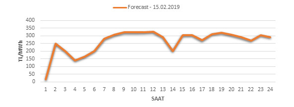 Yarından sonraki gün için oluşacak ortalama piyasa takas fiyatı 263.84 TL/MWH olarak tahmin edilmektedir. Buna bağlı olarak günün maksimum fiyatı 327 TL/MWh olarak 11:0012:00 saat aralığında, minimum fiyatı 16.01 TL/MWh olarak :0001:00 saat aralığında gerçekleşeceği öngörülmektedir. Puant saatlerde (17:0022:00) tahmini ortalama piyasa takas fiyatı ise 300.78 TL/MWh olarak hesaplanabilmektedir. Saatlik oluşacak piyasa takas fiyatı tahminleri aşağıdaki grafikte yer almaktadır.