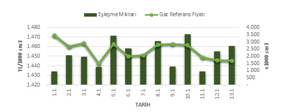 Organize Toptan Doğal Gaz Satış Piyasası (OTSP) dahilinde 01.02.201913.02.2019 tarihleri arası ortalama Gaz Referans Fiyatı (GRF) 1,455.85 TL/1000 sm3 olarak belirlenirken, aynı tarihler arasında toplam gerçekleşen eşleşmelerin miktarı ise 28,200 x1000 sm3 olarak belirlendi. İlgili tarihler arasında günlük Gaz Referans Fiyatı (GRF) ile Eşleşme Miktarı verileri aşağıdaki grafikte yer almaktadır.