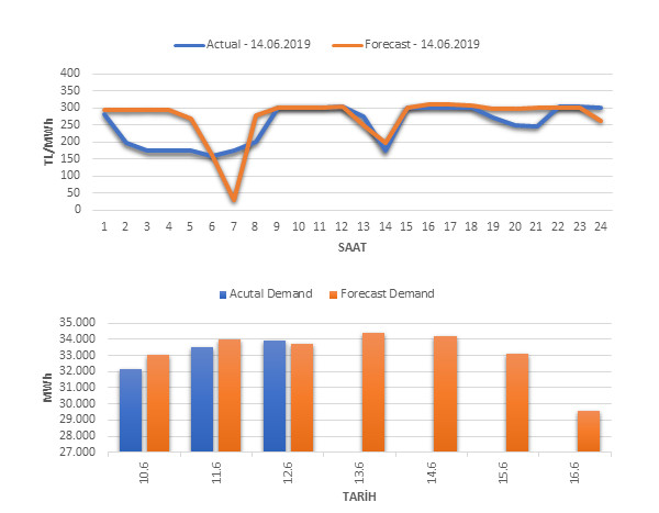 Tahminleme Modeli* analizi sonucu ortalama piyasa takas fiyatı 274.95 TL/MWh ve ortalama tüketim 34,204 MWh olarak öngörülmektedir. Modelin piyasa takas fiyatına dair başarı oranı günlük % 58, tüketime dair başarı oranı** ise günlük % 99 olarak hesaplanırken, bugüne kadar yapılan piyasa takas fiyatına dair analizlere göre başarı oranı % 89, tüketime dair başarı oranı ise % 95 olarak hesaplanmaktadır. Saatlik yarın için oluşan ve tahmin edilen piyasa takas fiyatları ile haftalık bazda tahmin edilen ve gerçekleştikçe yer alacak günlük ortalama tüketim değerleri aşağıdaki grafiklerde yer almaktadır.