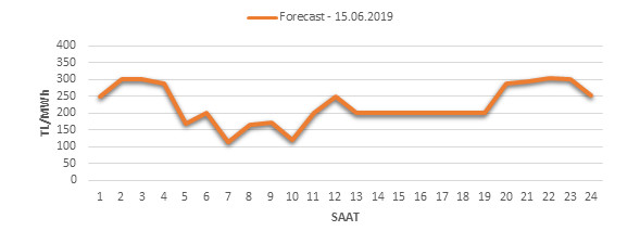 Yarından sonraki gün için oluşacak ortalama piyasa takas fiyatı 223.96 TL/MWH olarak tahmin edilmektedir. Buna bağlı olarak günün maksimum fiyatı 304.56 TL/MWh olarak 21:00 – 22:00 saat aralığında, minimum fiyatı 113.65 TL/MWh olarak 06:00 – 07:00 saat aralığında gerçekleşeceği öngörülmektedir. Puant saatlerde (17:00 – 22:00) tahmini ortalama piyasa takas fiyatı ise 265.15 TL/MWh olarak hesaplanabilmektedir. Saatlik oluşacak piyasa takas fiyatı tahminleri aşağıdaki grafikte yer almaktadır.