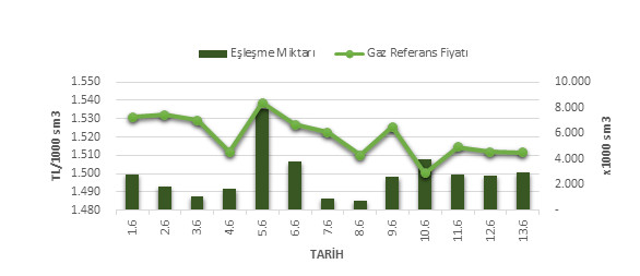 Organize Toptan Doğal Gaz Satış Piyasası (OTSP) dahilinde 01.06.2019 – 13.06.2019 tarihleri arası ortalama Gaz Referans Fiyatı (GRF) 1,520.36 TL/1000 sm3 olarak belirlenirken, aynı tarihler arasında toplam gerçekleşen eşleşmelerin miktarı ise 35,716 x1000 sm3 olarak belirlendi. İlgili tarihler arasında günlük Gaz Referans Fiyatı (GRF) ile Eşleşme Miktarı verileri aşağıdaki grafikte yer almaktadır.