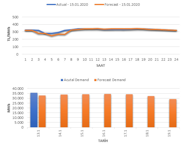 Tahminleme Modeli* analizi sonucu ortalama piyasa takas fiyatı 320.18 TL/MWh ve ortalama tüketim 34,084 MWh olarak öngörülmektedir. Modelin piyasa takas fiyatına dair başarı oranı günlük % 72, tüketime dair başarı oranı** ise günlük % 93 olarak hesaplanırken, bugüne kadar yapılan piyasa takas fiyatına dair analizlere göre başarı oranı % 91, tüketime dair başarı oranı ise % 94 olarak hesaplanmaktadır. Saatlik yarın için oluşan ve tahmin edilen piyasa takas fiyatları ile haftalık bazda tahmin edilen ve gerçekleştikçe yer alacak günlük ortalama tüketim değerleri aşağıdaki grafiklerde yer almaktadır.