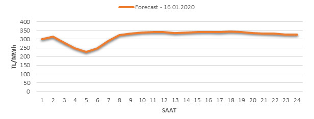 Yarından sonraki gün için oluşacak ortalama piyasa takas fiyatı 317.63 TL/MWH olarak tahmin edilmektedir. Buna bağlı olarak günün maksimum fiyatı 343.94 TL/MWh olarak 17:00 – 18:00 saat aralığında, minimum fiyatı 225.42 TL/MWh olarak 04:00 – 05:00 saat aralığında gerçekleşeceği öngörülmektedir. Puant saatlerde (17:00 – 22:00) tahmini ortalama piyasa takas fiyatı ise 335.62 TL/MWh olarak hesaplanabilmektedir. Saatlik oluşacak piyasa takas fiyatı tahminleri aşağıdaki grafikte yer almaktadır.