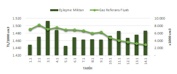Organize Toptan Doğal Gaz Satış Piyasası (OTSP) dahilinde 01.01.2020 – 14.01.2020 tarihleri arası ortalama Gaz Referans Fiyatı (GRF) 1,477.99 TL/1000 sm3 olarak belirlenirken, aynı tarihler arasında toplam gerçekleşen eşleşmelerin miktarı ise 73,348 x1000 sm3 olarak belirlendi. İlgili tarihler arasında günlük Gaz Referans Fiyatı (GRF) ile Eşleşme Miktarı verileri aşağıdaki grafikte yer almaktadır.