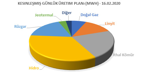 Bir önceki gün ile kıyaslandığında ortalama piyasa takas fiyatında –102.52 TL düşüş gözlemlenmektedir. Kesinleşmiş Günlük Üretim Planı (KGÜP) verilerine bakıldığında termik enerji dahilinde doğal gaz % 7, linyit % 13, ithal kömür % 22 oranında üretimin gerçekleşmesi beklenirken, yenilenebilir enerji dahilinde ise hidro % 34, rüzgar % 18, jeotermal % 3 oranında üretimin gerçekleşmesi beklenmektedir. Bununla birlikte fiyatlardaki düşüş, hafta sonu tüketim talebindeki düşüş ve üretimin ağırlıklı olarak hidroelektrik santrallerinde beklenmesi ile açıklanabilmektedir. Yarın için planlanan üretim bazlı Kesinleşmiş Günlük Üretim Planı (KGÜP) aşağıdaki grafikte yer almaktadır.
