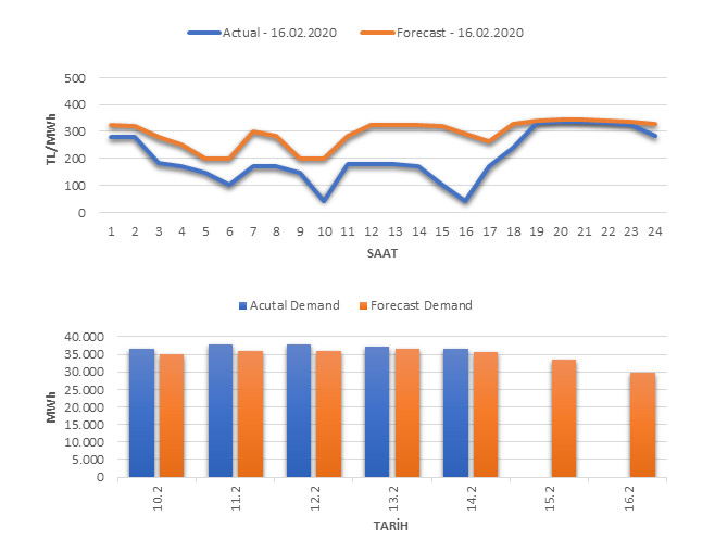 Tahminleme Modeli* analizi sonucu ortalama piyasa takas fiyatı 291.98 TL/MWh ve ortalama tüketim 29,704 MWh olarak öngörülmektedir. Modelin piyasa takas fiyatına dair başarı oranı günlük % 62, tüketime dair başarı oranı** ise günlük % 98 olarak hesaplanırken, bugüne kadar yapılan piyasa takas fiyatına dair analizlere göre başarı oranı % 91, tüketime dair başarı oranı ise % 94 olarak hesaplanmaktadır. Saatlik yarın için oluşan ve tahmin edilen piyasa takas fiyatları ile haftalık bazda tahmin edilen ve gerçekleştikçe yer alacak günlük ortalama tüketim değerleri aşağıdaki grafiklerde yer almaktadır.
