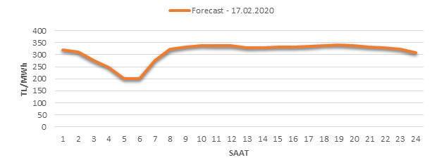 Yarından sonraki gün için oluşacak ortalama piyasa takas fiyatı 311.63 TL/MWH olarak tahmin edilmektedir. Buna bağlı olarak günün maksimum fiyatı 341.57 TL/MWh olarak 18:00 – 19:00 saat aralığında, minimum fiyatı 200 TL/MWh olarak 04:00 – 05:00 saat aralığında gerçekleşeceği öngörülmektedir. Puant saatlerde (17:00 – 22:00) tahmini ortalama piyasa takas fiyatı ise 334.3 TL/MWh olarak hesaplanabilmektedir. Saatlik oluşacak piyasa takas fiyatı tahminleri aşağıdaki grafikte yer almaktadır.