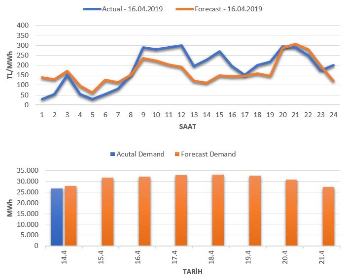 Tahminleme Modeli* analizi sonucu ortalama piyasa takas fiyatı 166.47 TL/MWh ve ortalama tüketim 32,131 MWh olarak öngörülmektedir. Modelin piyasa takas fiyatına dair başarı oranı günlük % 76, tüketime dair başarı oranı** ise günlük % 95 olarak hesaplanırken, bugüne kadar yapılan piyasa takas fiyatına dair analizlere göre başarı oranı % 88, tüketime dair başarı oranı ise % 95 olarak hesaplanmaktadır. Saatlik yarın için oluşan ve tahmin edilen piyasa takas fiyatları ile haftalık bazda tahmin edilen ve gerçekleştikçe yer alacak günlük ortalama tüketim değerleri aşağıdaki grafiklerde yer almaktadır.