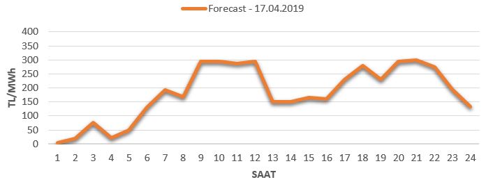 Yarından sonraki gün için oluşacak ortalama piyasa takas fiyatı 183.19 TL/MWH olarak tahmin edilmektedir. Buna bağlı olarak günün maksimum fiyatı 299.67 TL/MWh olarak 20:00 – 21:00 saat aralığında, minimum fiyatı 3.55 TL/MWh olarak :00 – 01:00 saat aralığında gerçekleşeceği öngörülmektedir. Puant saatlerde (17:00 – 22:00) tahmini ortalama piyasa takas fiyatı ise 262.24 TL/MWh olarak hesaplanabilmektedir. Saatlik oluşacak piyasa takas fiyatı tahminleri aşağıdaki grafikte yer almaktadır.