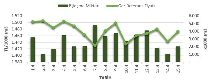 Organize Toptan Doğal Gaz Satış Piyasası (OTSP) dahilinde 01.03.2019 – 15.04.2019 tarihleri arası ortalama Gaz Referans Fiyatı (GRF) 1,473.63 TL/1000 sm3 olarak belirlenirken, aynı tarihler arasında toplam gerçekleşen eşleşmelerin miktarı ise 40,690 x1000 sm3 olarak belirlendi. İlgili tarihler arasında günlük Gaz Referans Fiyatı (GRF) ile Eşleşme Miktarı verileri aşağıdaki grafikte yer almaktadır.