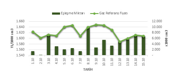 Organize Toptan Doğal Gaz Satış Piyasası (OTSP) dahilinde 01.10.2018 – 15.10.2018 tarihleri arası ortalama Gaz Referans Fiyatı (GRF) 1.620,69 TL/1000 sm3 olarak belirlenirken, aynı tarihler arasında toplam gerçekleşen eşleşmelerin miktarı ise 63,694 x1000 sm3 olarak belirlendi. İlgili tarihler arasında günlük Gaz Referans Fiyatı (GRF) ile Eşleşme Miktarı verileri aşağıdaki grafikte yer almaktadır.