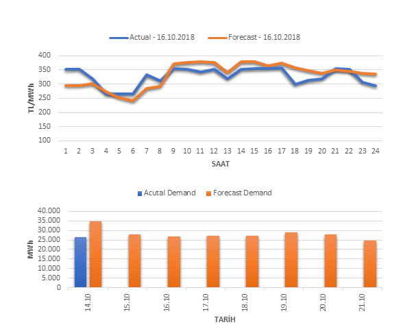 Tahminleme Modeli* analizi sonucu ortalama piyasa takas fiyatı 333,47 TL/MWh ve ortalama tüketim 26.698 MWh olarak öngörülmektedir. Modelin piyasa takas fiyatına dair başarı oranı günlük % 76, tüketime dair başarı oranı** ise günlük % 69 olarak hesaplanırken, bugüne kadar yapılan piyasa takas fiyatına dair analizlere göre başarı oranı % 86, tüketime dair başarı oranı ise % 92 olarak hesaplanmaktadır. Saatlik yarın için oluşan ve tahmin edilen piyasa takas fiyatları ile haftalık bazda tahmin edilen ve gerçekleştikçe yer alacak günlük ortalama tüketim değerleri aşağıdaki grafiklerde yer almaktadır.