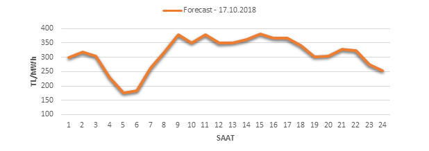 Yarından sonraki gün için oluşacak ortalama piyasa takas fiyatı 311,15 TL/MWH olarak tahmin edilmektedir. Buna bağlı olarak günün maksimum fiyatı 379,92 TL/MWh olarak 14:00 – 15:00 saat aralığında, minimum fiyatı 175,42 TL/MWh olarak 04:00 – 05:00 saat aralığında gerçekleşeceği öngörülmektedir. Puant saatlerde (17:00 – 22:00) tahmini ortalama piyasa takas fiyatı ise 310,66 TL/MWh olarak hesaplanabilmektedir. Saatlik oluşacak piyasa takas fiyatı tahminleri aşağıdaki grafikte yer almaktadır.