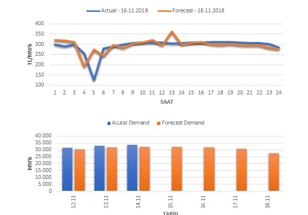 Tahminleme Modeli* analizi sonucu ortalama piyasa takas fiyatı 294.6 TL/MWh ve ortalama tüketim 31,948 MWh olarak öngörülmektedir. Modelin piyasa takas fiyatına dair başarı oranı günlük % 80, tüketime dair başarı oranı** ise günlük % 95 olarak hesaplanırken, bugüne kadar yapılan piyasa takas fiyatına dair analizlere göre başarı oranı % 87, tüketime dair başarı oranı ise % 92 olarak hesaplanmaktadır. Saatlik yarın için oluşan ve tahmin edilen piyasa takas fiyatları ile haftalık bazda tahmin edilen ve gerçekleştikçe yer alacak günlük ortalama tüketim değerleri aşağıdaki grafiklerde yer almaktadır.