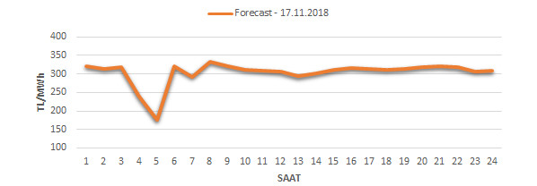 Yarından sonraki gün için oluşacak ortalama piyasa takas fiyatı 302.71 TL/MWH olarak tahmin edilmektedir. Buna bağlı olarak günün maksimum fiyatı 332.02 TL/MWh olarak 07:00 – 08:00 saat aralığında, minimum fiyatı 175.21 TL/MWh olarak 04:00 – 05:00 saat aralığında gerçekleşeceği öngörülmektedir. Puant saatlerde (17:00 – 22:00) tahmini ortalama piyasa takas fiyatı ise 313.59 TL/MWh olarak hesaplanabilmektedir. Saatlik oluşacak piyasa takas fiyatı tahminleri aşağıdaki grafikte yer almaktadır.