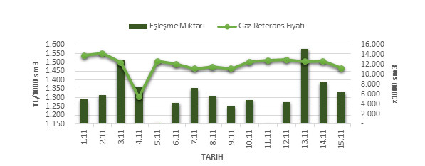 Organize Toptan Doğal Gaz Satış Piyasası (OTSP) dahilinde 01.10.2018 – 15.11.2018 tarihleri arası ortalama Gaz Referans Fiyatı (GRF) 1,485.98 TL/1000 sm3 olarak belirlenirken, aynı tarihler arasında toplam gerçekleşen eşleşmelerin miktarı ise 91,287 x1000 sm3 olarak belirlendi. İlgili tarihler arasında günlük Gaz Referans Fiyatı (GRF) ile Eşleşme Miktarı verileri aşağıdaki grafikte yer almaktadır.