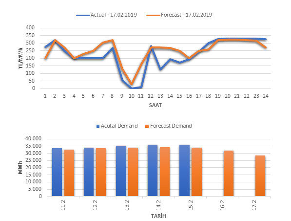 Tahminleme Modeli* analizi sonucu ortalama piyasa takas fiyatı 253.93 TL/MWh ve ortalama tüketim 28,589 MWh olarak öngörülmektedir. Modelin piyasa takas fiyatına dair başarı oranı günlük % 81, tüketime dair başarı oranı** ise günlük % 94 olarak hesaplanırken, bugüne kadar yapılan piyasa takas fiyatına dair analizlere göre başarı oranı % 88, tüketime dair başarı oranı ise % 94 olarak hesaplanmaktadır. Saatlik yarın için oluşan ve tahmin edilen piyasa takas fiyatları ile haftalık bazda tahmin edilen ve gerçekleştikçe yer alacak günlük ortalama tüketim değerleri aşağıdaki grafiklerde yer almaktadır.