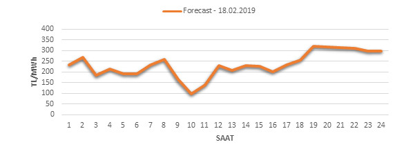 Yarından sonraki gün için oluşacak ortalama piyasa takas fiyatı 232.85 TL/MWH olarak tahmin edilmektedir. Buna bağlı olarak günün maksimum fiyatı 318.57 TL/MWh olarak 18:00 – 19:00 saat aralığında, minimum fiyatı 97.83 TL/MWh olarak 09:00 – 10:00 saat aralığında gerçekleşeceği öngörülmektedir. Puant saatlerde (17:00 – 22:00) tahmini ortalama piyasa takas fiyatı ise 301.05 TL/MWh olarak hesaplanabilmektedir. Saatlik oluşacak piyasa takas fiyatı tahminleri aşağıdaki grafikte yer almaktadır.