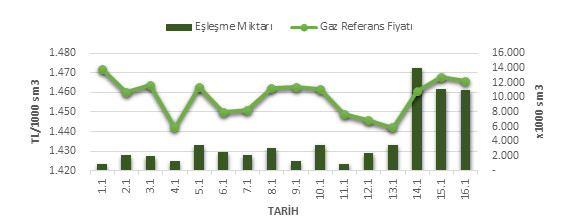 Organize Toptan Doğal Gaz Satış Piyasası (OTSP) dahilinde 01.02.2019 – 16.02.2019 tarihleri arası ortalama Gaz Referans Fiyatı (GRF) 1,457.28 TL/1000 sm3 olarak belirlenirken, aynı tarihler arasında toplam gerçekleşen eşleşmelerin miktarı ise 65,050 x1000 sm3 olarak belirlendi. İlgili tarihler arasında günlük Gaz Referans Fiyatı (GRF) ile Eşleşme Miktarı verileri aşağıdaki grafikte yer almaktadır.